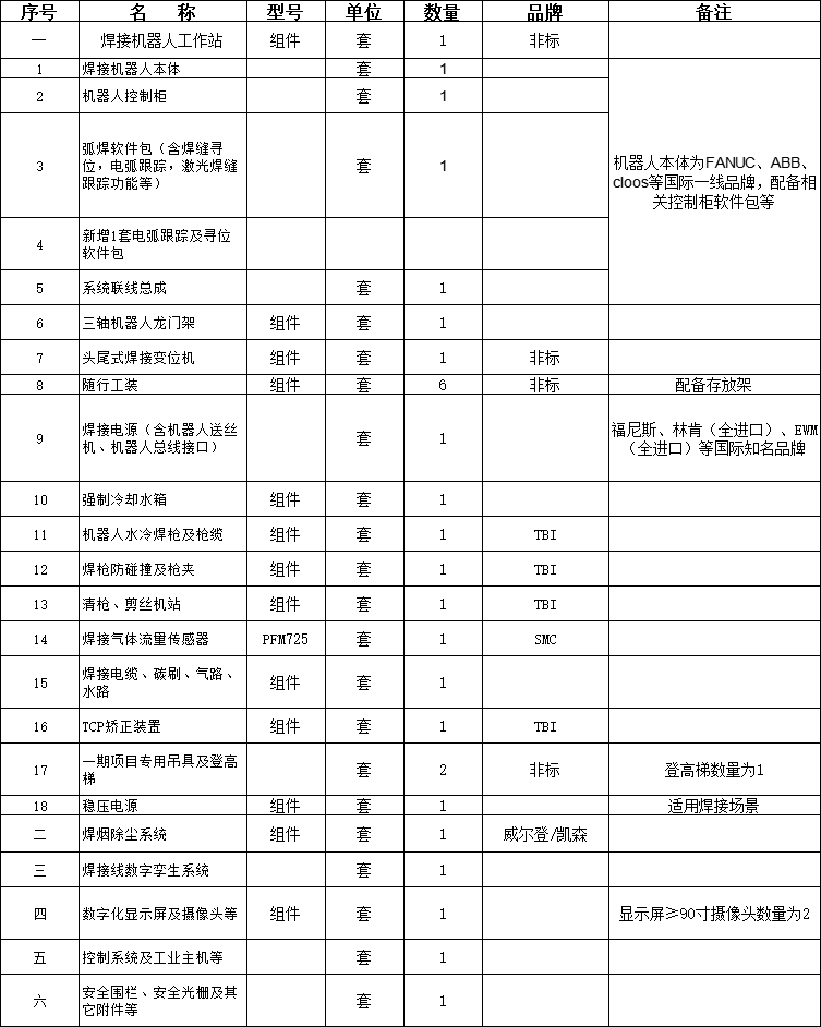 6. 項目(mu)概(gai)況(kuang):該項目(mu)為前(qian)機架焊(han)接(jie)生產線項目(mu)一期,其(qi)包含整線設計方案(an)和(he)一期前(qian)機架通用(yong)焊(han)接(jie)工(gong)作站及其(qi)附件的實施(shi),其(qi)中(zhong)整線方案(an)設計應包括詳細的三(san)維方案(an)、配(pei)置和(he)工(gong)藝(yi)布局(ju)、數字孿生方案(an)等,整線包括1上料(liao)工(gong)位(wei)、2焊(han)接(jie)工(gong)位(wei)、1下料(liao)補焊(han)工(gong)位(wei),適用(yong)于前(qian)機架的自(zi)動(dong)上下料(liao)、自(zi)動(dong)化焊(han)接(jie)、人(ren)工(gong)補焊(han)。投標(biao)技術方案(an)中(zhong)應充(chong)分考慮人(ren)機交互的安(an)全(quan)隔(ge)離問(wen)題,需出具(ju)詳細的可行性方案(an),清晰(xi)說(shuo)明安(an)全(quan)防護邏輯及具(ju)體安(an)全(quan)措(cuo)施(shi)。