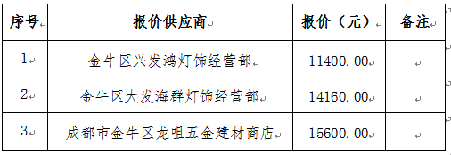本次到市場詢價單位共計叁家。按照滿足要求最低價成交的原則確定最終供應商為:金牛區興發鴻燈飾經營部。如有異議,請于本通知發布次日內以書面形式反饋至我部門,過時視為認同。