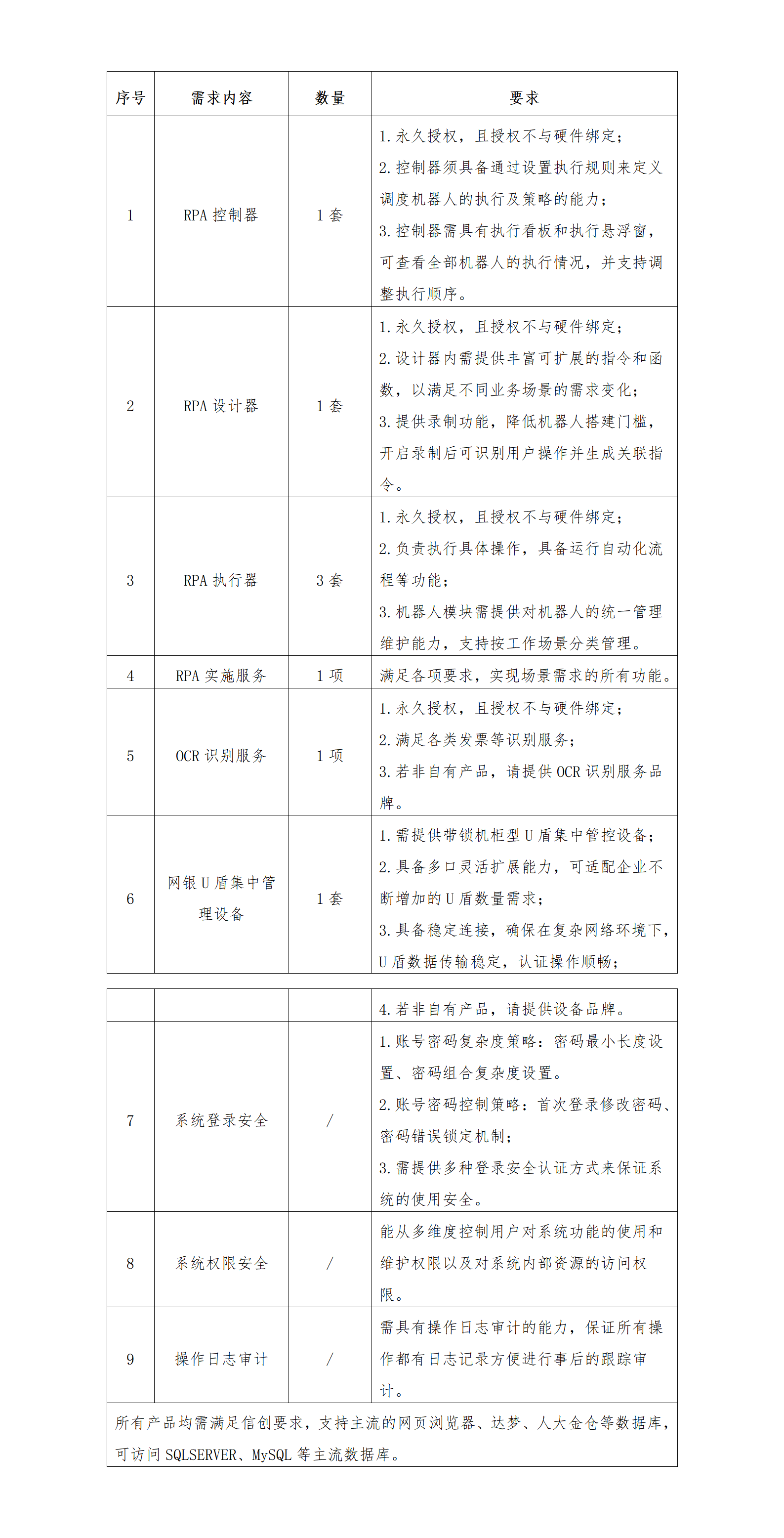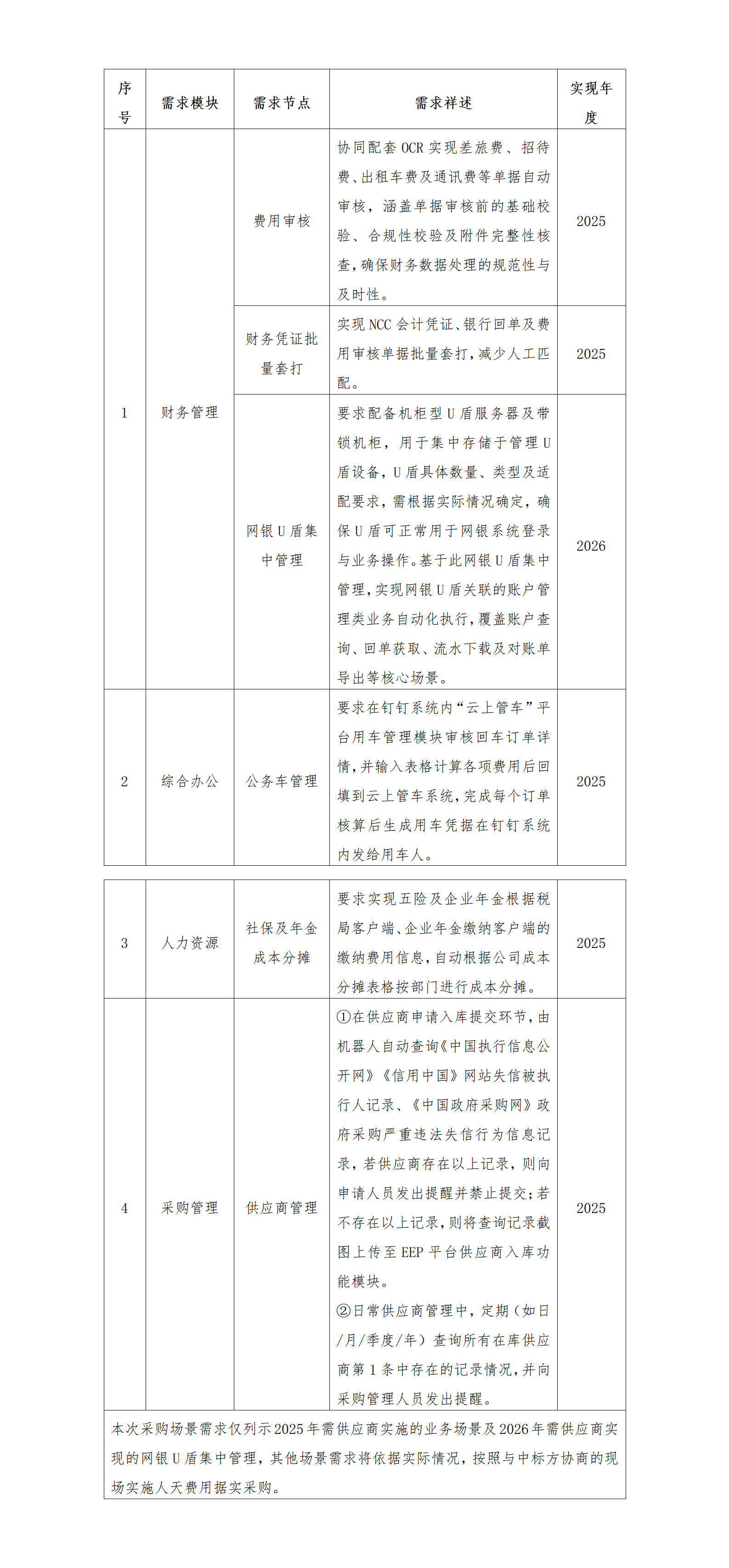 2.采購需求:開發使用RPA軟件產品,輔助實現費用單據自動審核、財務憑證批量套打、網銀U盾關聯的賬戶管理類業務自動執行、公務車管理、社保及年金成本分攤及供應商管理等核心場景。(詳見本談判公告第四部分)