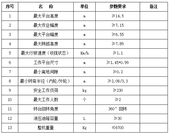 6. 項目概況:采購一臺自動自行走登高車,主要技術參數