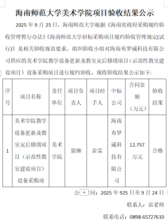 2025年9月25日,******大學招標采購項目履約驗收管理規定(試行)》及相關驗收規范要求,組織驗收小組對******有限公司供應的******學院教學設備更新及教室災后修繕項目(示范性教室建設項目)設備采購項目進行履約驗收。現將驗收結果公示如下: