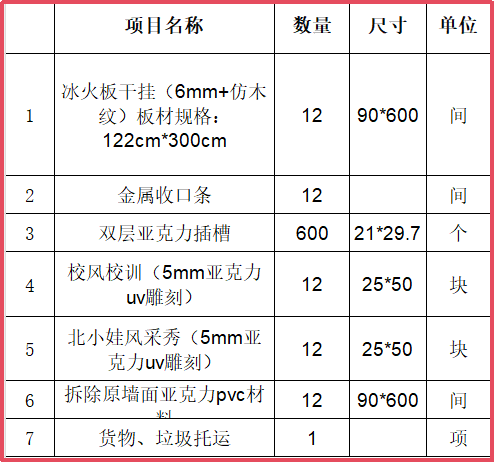特別說明:每個班級展示區域尺寸約為6米(長)×0.9米(高),投標人需在投標前提前預約勘察現場,詳細了解施工條件。