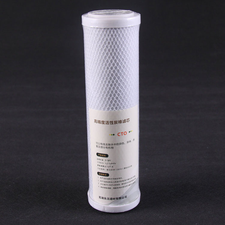 1、壓縮活性炭濾芯采用吸附值高的煤基活性炭和椰殼活性炭為過濾材料,用食品級膠粘劑燒結壓縮而成。壓縮活性炭濾芯內外分別包裹一層具有過濾功能的無紡布,以保證炭芯本身不掉碳粉,炭芯兩端裝有軟質丁腈橡膠墊片,使炭芯進入濾筒具有良好的密封性能。